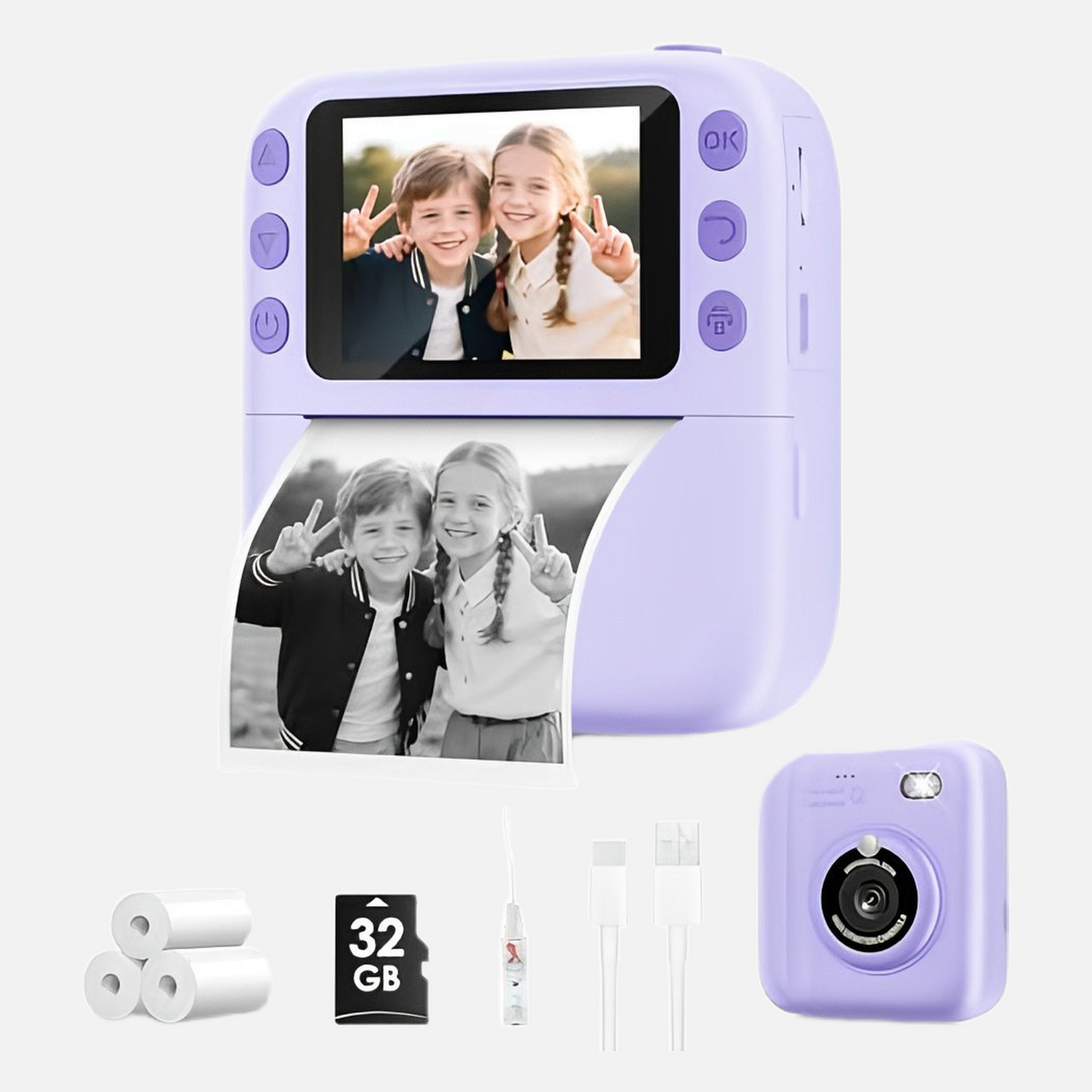 I bought this camera for my child, and it has been such a hit! The color is adorable, the size is perfect for little hands, and it’s super easy to use. The instant print feature works great — the photos come out quickly and look so cute! I love that it comes with a 32GB SD card and extra paper rolls, so everything is ready to go right out of the box. The picture quality is clear, and my kid loves seeing their photos print instantly. It even takes videos, which was such a fun surprise! Definitely a great value and such a wonderful gift idea for kids. Highly recommend this camera to any parent — your little one will absolutely love it! 💜📸