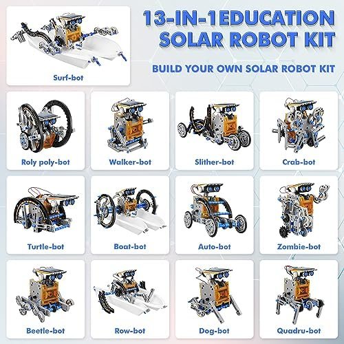 13-in-1 Solar Robot Kit: Kids can follow the step-by-step user’s manual to build 13 different types of robots by splitting and reassembling, which can move on land or water. Includes the robot’s moving and connecting parts like gears, plates, tires, and shafts. Parts can be easily disassembled after completion of every robot build. Cool Science Kit for Boys and Girls Aged 8-12