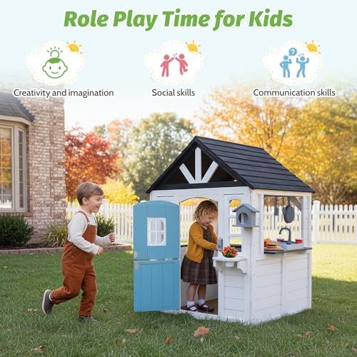 Promotes Social Skills: This playhouse for kids outdoor mimics real-life scenarios with a working doorbell and window flowerpot holders. Kids practice sharing and teamwork as they role-play, enhancing communication skills and emotional growth while having fun together