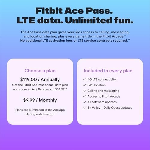 - LTE DATA FOR UNLIMITED FUN – The Fitbit Ace Pass data plan gives you access to calling, messaging, and location sharing; plus, kids get every game title in the Fitbit Arcade[4,7]