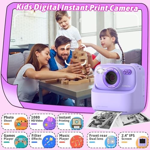 【Multi-functional Kids Digital Instant Print Camera 】This digital camera has instant printing, flash, 2.4-inch large screen, 3 puzzle games, 28 cute frames and 6 filters, selfie dual cameras (Front/Rear lens), real-time video recording, time lapse capture, MP3 music player.