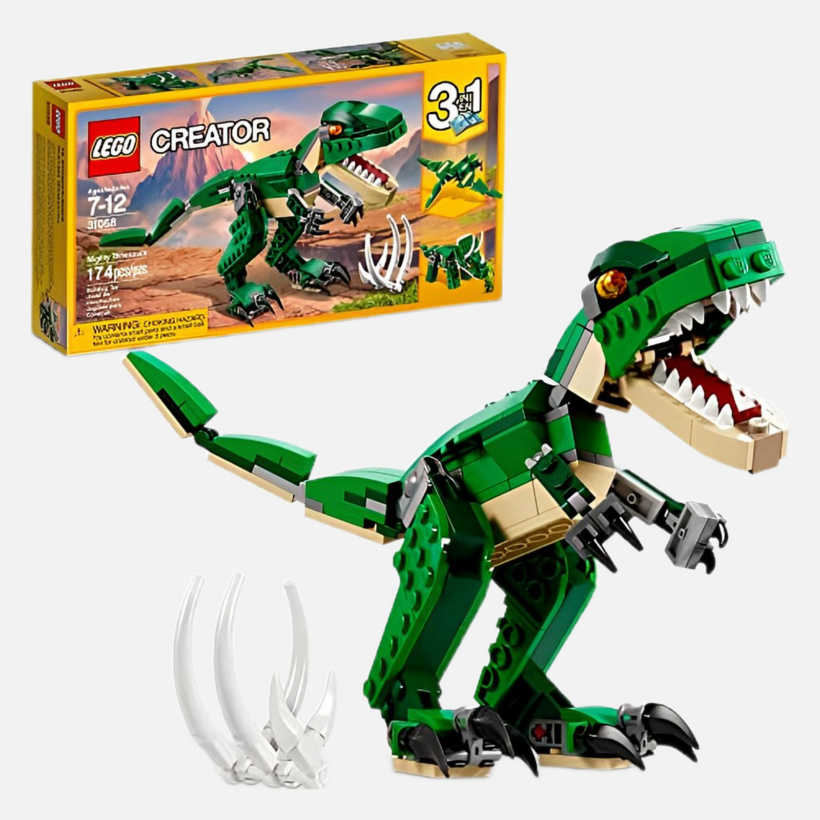 Kids aged 7-12 can roar into action with the mighty LEGO Creator Mighty Dinosaur (31058) 3in1 set. With this buildable dinosaur set, kids will have fun building the awesome T. rex toy, featuring a dark-green and beige color scheme, bright orange eyes, posable joints and head, large claws and an opening mouth with pointed teeth. Also includes the dinosaur’s prey in the form of a buildable rib cage. Kids can rebuild this 3in1 LEGO Creator Mighty Dinosaurs model to create a Triceratops toy or a Pterodactyl. LEGO Creator 3in1 toys are a great option for helping young ones enhance their imaginations or for collecting display sets that they can change to suit mood and space. This dinosaur building toy for kids aged 7-12 years old makes a great birthday or Christmas gift for young dinosaur fans. T. rex measures over 4 in. (11 cm) tall. Triceratops measures over 3 in. (9 cm) tall. Pterodactyl measures over 1 in. (4 cm) high, 7 in. (18 cm) long and 9 in. (25 cm) wide. Contains 174 pieces.