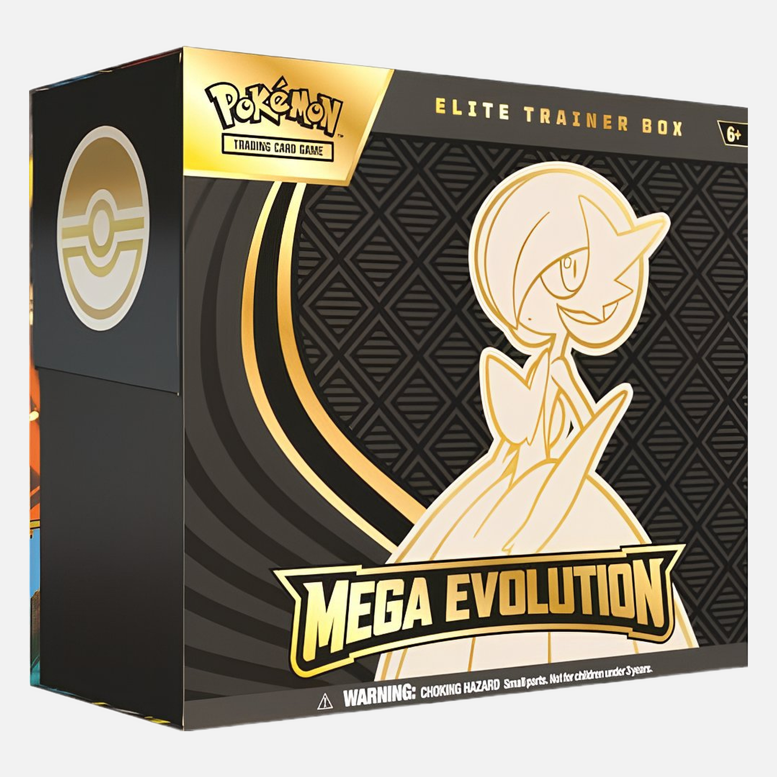 - The Pokémon TCG: Mega Evolution Elite Trainer Box includes 9 Pokémon TCG: Mega Evolution booster packs, 1 full-art foil promo card featuring Riolu or Alakazam, and 65 card sleeves.