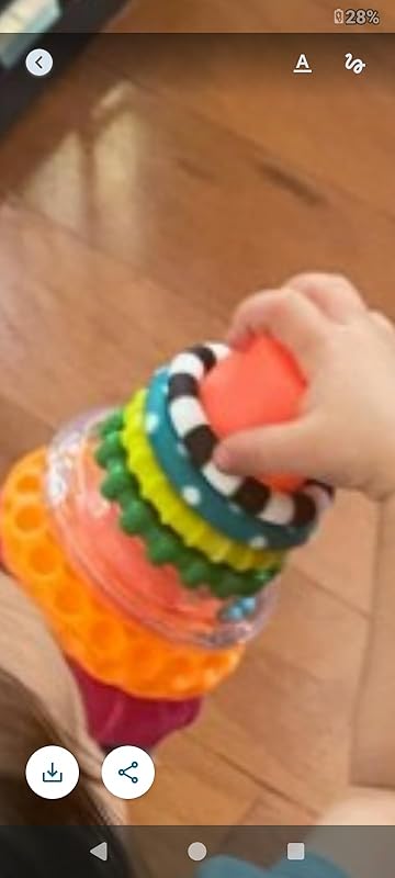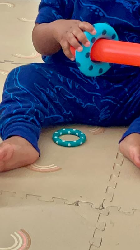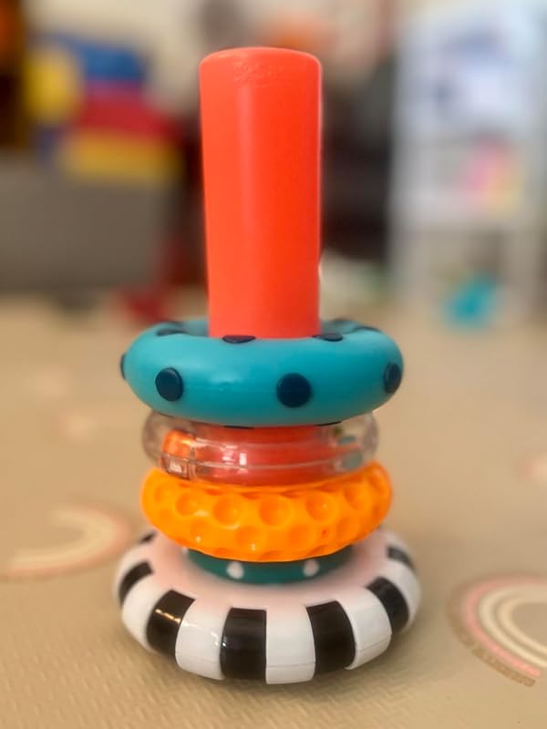 ⚠️ Smaller rings have a funny way of “walking off” with older siblings or disappearing under the couch… keep an eye out!This stacking toy is a solid update on the classic, fun colors AND it’s at a great price point. I highly recommend it as both a mom and a pediatric PT.* Photo 1: Baby pulling blue ring with dark dots off the red post of the stacker. Smaller green and white polka dot ring nearby on the play mat.* Photo 2: Close-up of the black-and-white base and textured rings. Not all rings shown, as the smaller ones are currently MIA!